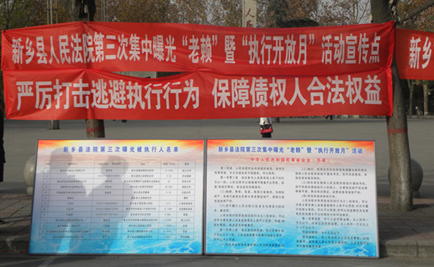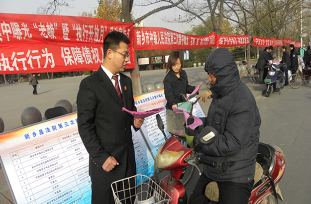 11月28日,新乡县法院执行干警走上街头,开展第三次集中曝光“赖帐户”暨“执行开开放月”宣传咨询活动。干警们通过现场宣传、解答群众各种问题,在全社会营造“理解执行、支持法院”的良好社会氛围,声威并重,确保活动实效。